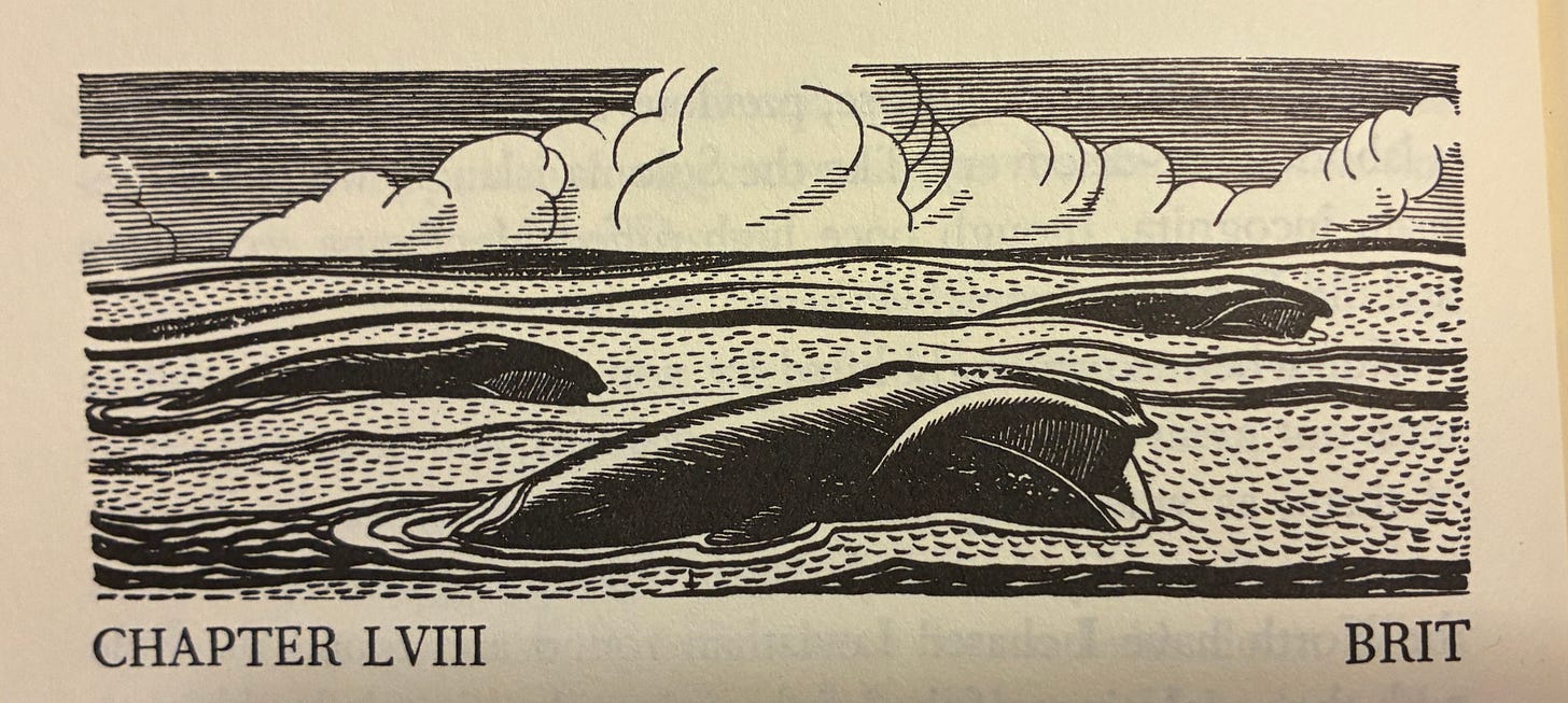 With that much attention, it’s hard not to be won over, but for me what finally clinches it is the way Melville pairs Ishmael’s gregariousness with candor about the leaden state of his soul. He handles Ishmael’s (and thus, it feels, my own) fragile mental health with such deftness. He acknowledges truths that are usually squelched, tells us straight away that darkness hangs overhead—suicide, pistols, coffins abound—all the while relentlessly cracking jokes. He makes light of horrors, but somehow without demeaning them. Yep, Melville suggests, it is just a little bit funny how f-ing depressed we all are, and how we all hope to soothe our souls by gazing at calming waters, and then, having failed at that, elect to engage in perilous, potentially lethal, aquatic activities such as signing on for two years before the mast. It’s funny, all right. Every kind of funny: Funny-sad. Funny-awful. Funny-odd.